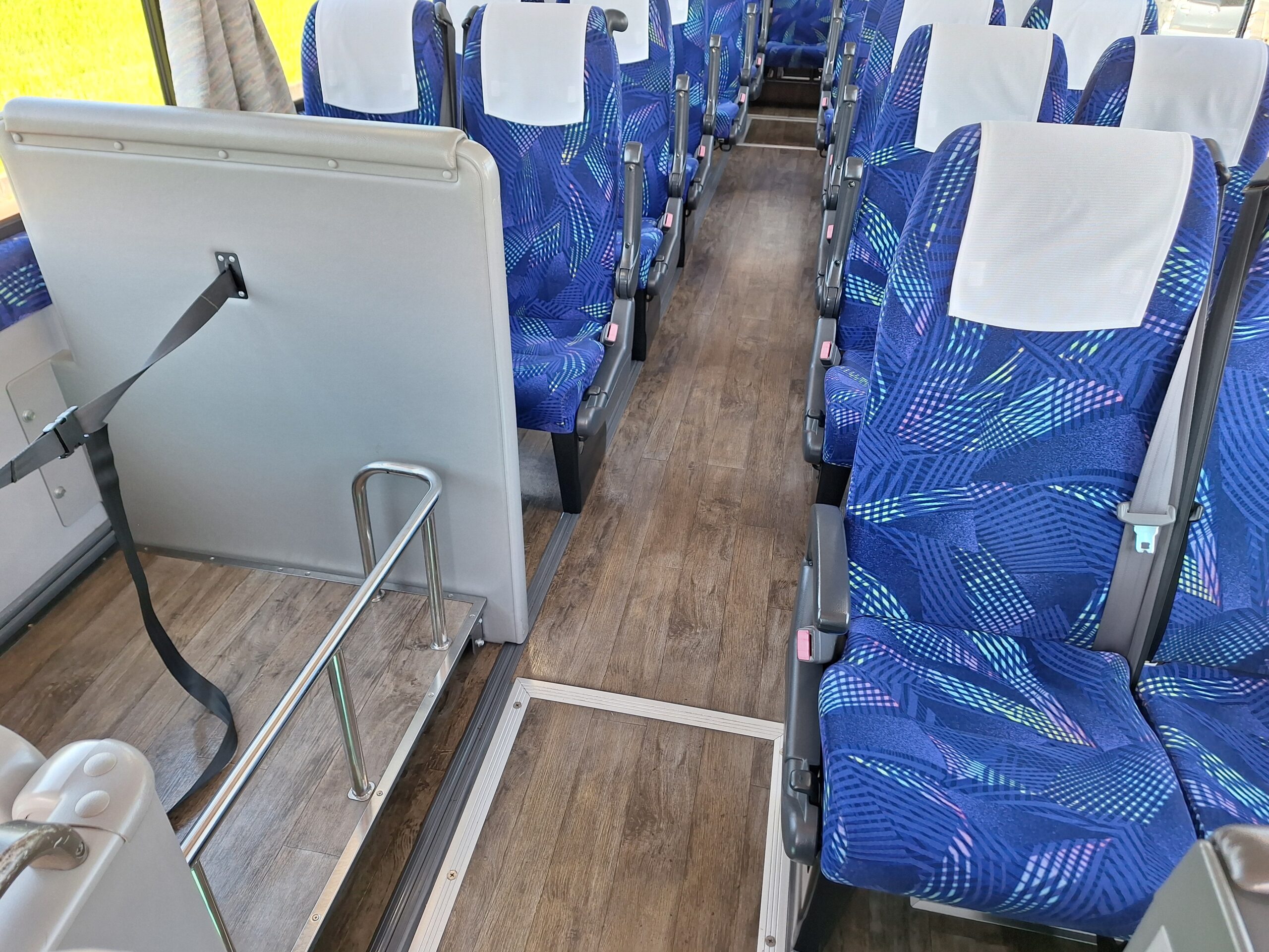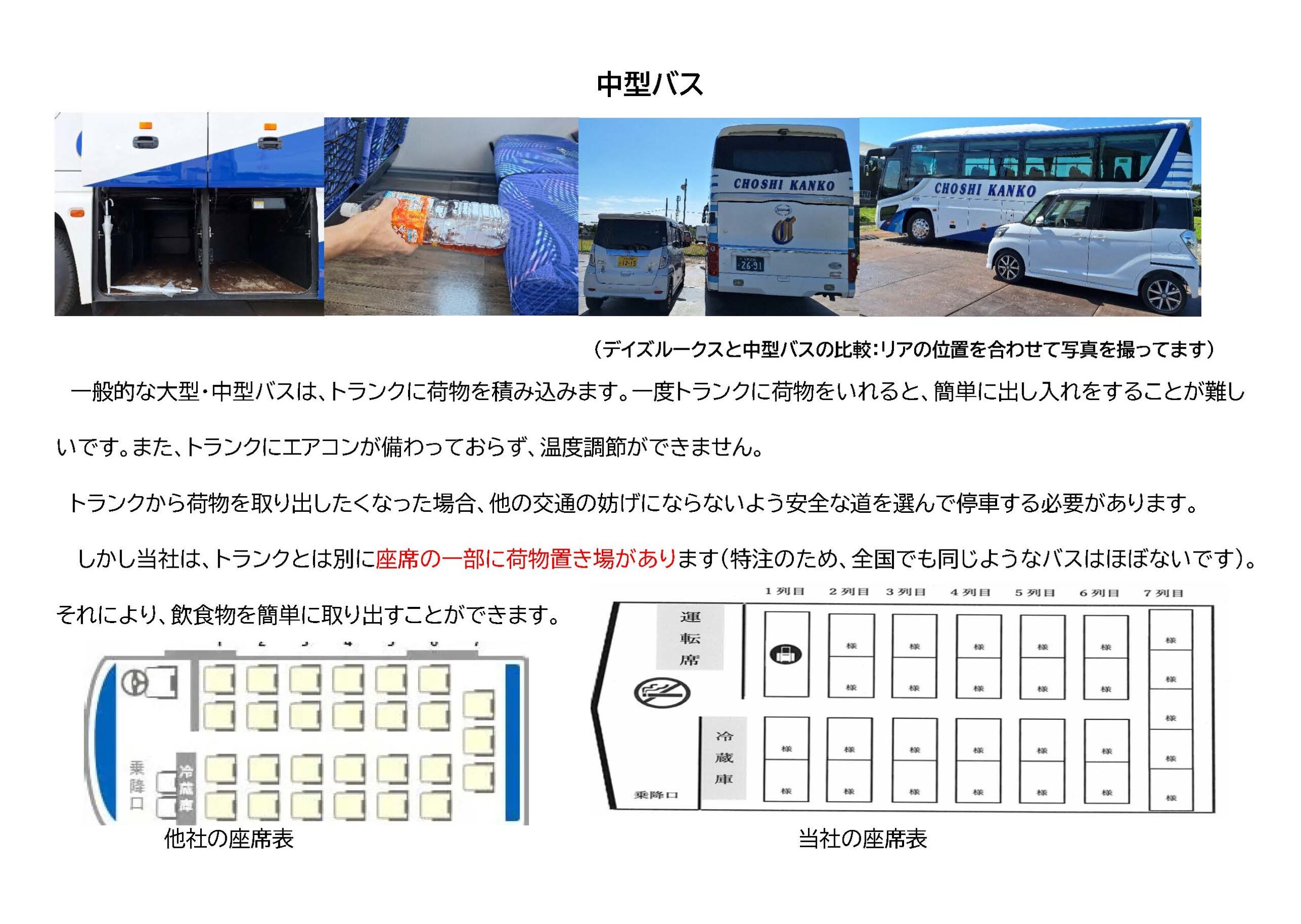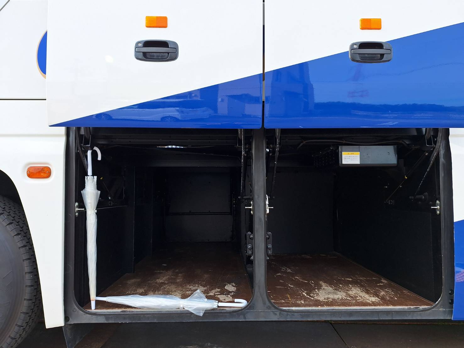 長さ12m、幅2m50cm 正座席45席 11列シート 補助席有り(8席)無しを選べます 装備:カラオケ・DVD(液晶モニター2基搭載) 冷蔵庫、ポット有り